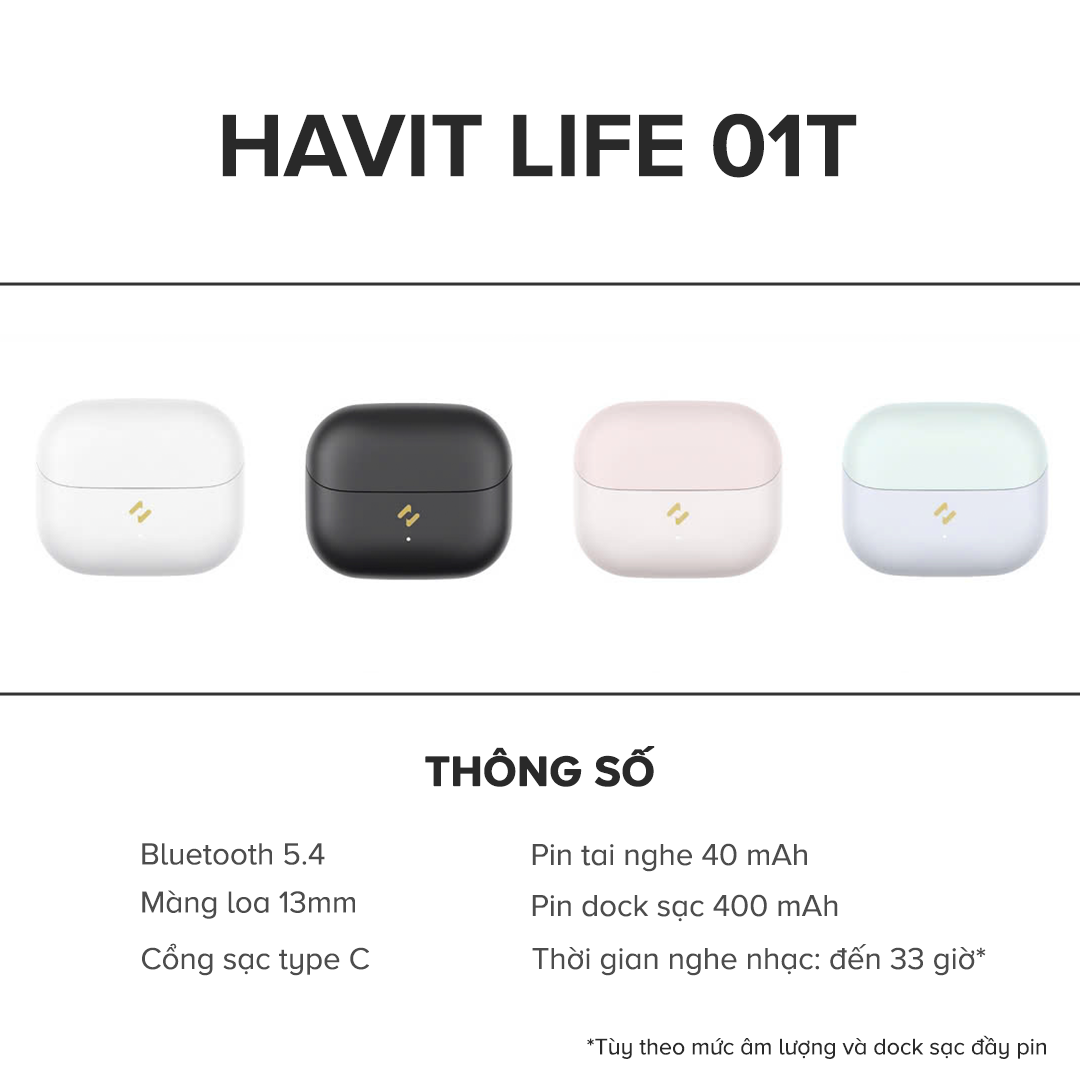 Tai Nghe TWS HAVIT Life 01T, BT 5.4 Gọn Nhẹ, Màng Loa 13mm, Công Nghệ AI Khử Ồn, Nghe Đến 33H - Hàng Chính Hãng