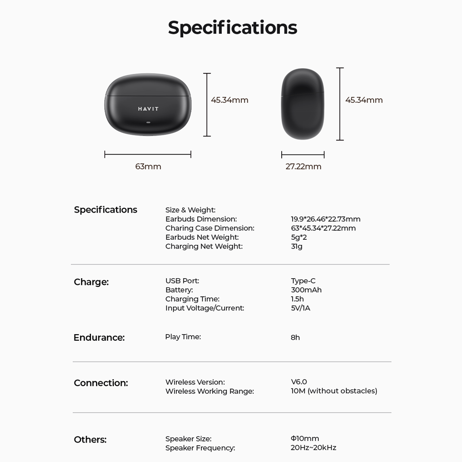 Tai Nghe TWS HAVIT TW907 SE, BT 6.0, Driver 10mm, 2 Mic ENC Hỗ Trợ Đàm Thoại, Nghe Đến 30H - Hàng Chính Hãng