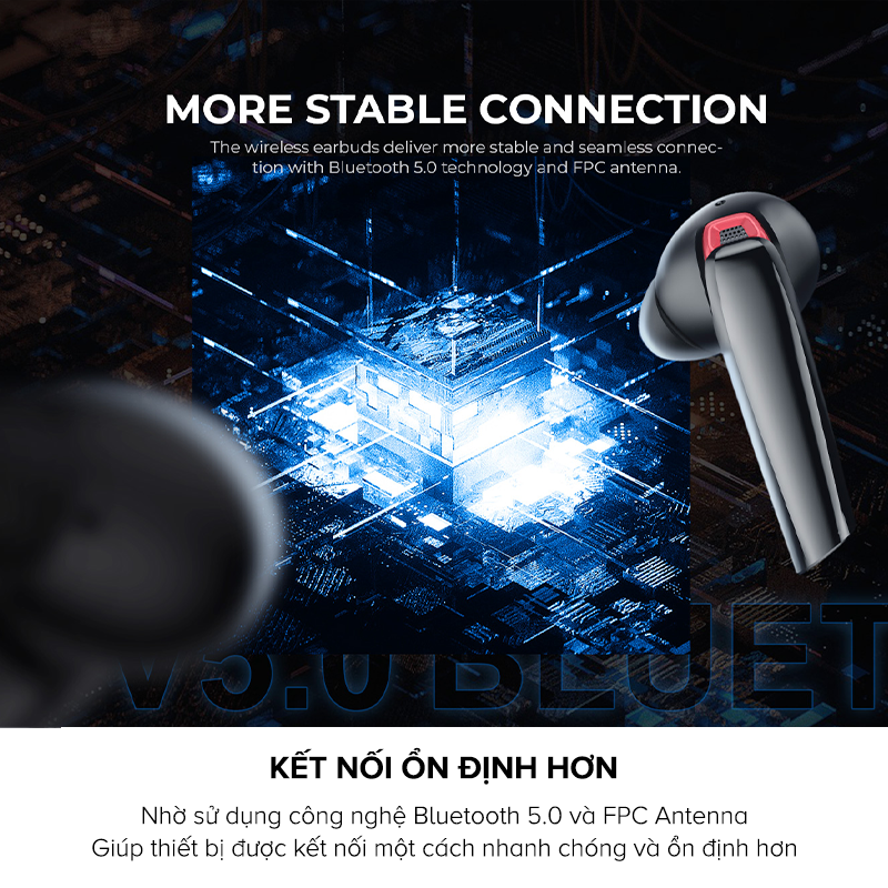 • Công nghệ Bluetooth 5.0  và FTC Atenna giúp tăng cường khả năng kết nối tai nghe với thiết bị nhanh chóng và ổn định hơn